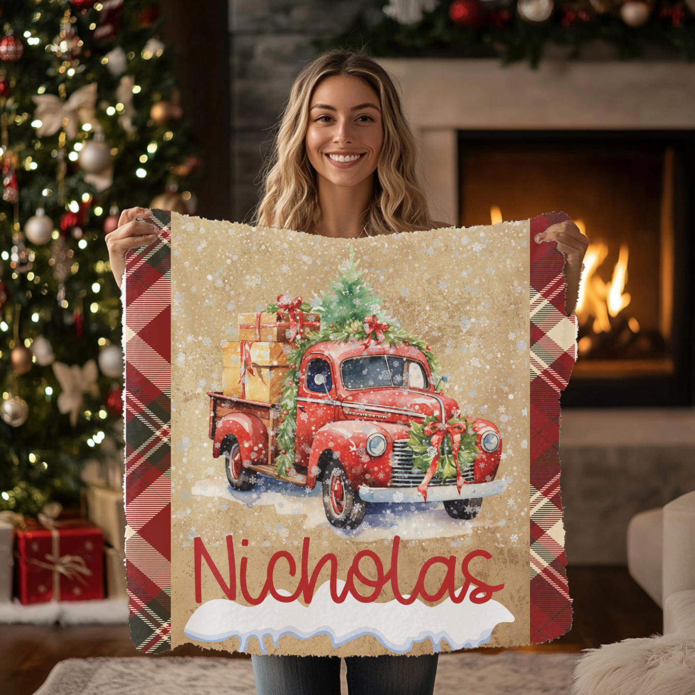 Wrap your little bundle of joy in warmth and comfort with our personalized baby blanket. Our Christmas Truck Blanket rolls in with a charming plaid border and snow softly falling over the vintage truck, while the personalized option offers a one-of-a-kind keepsake.