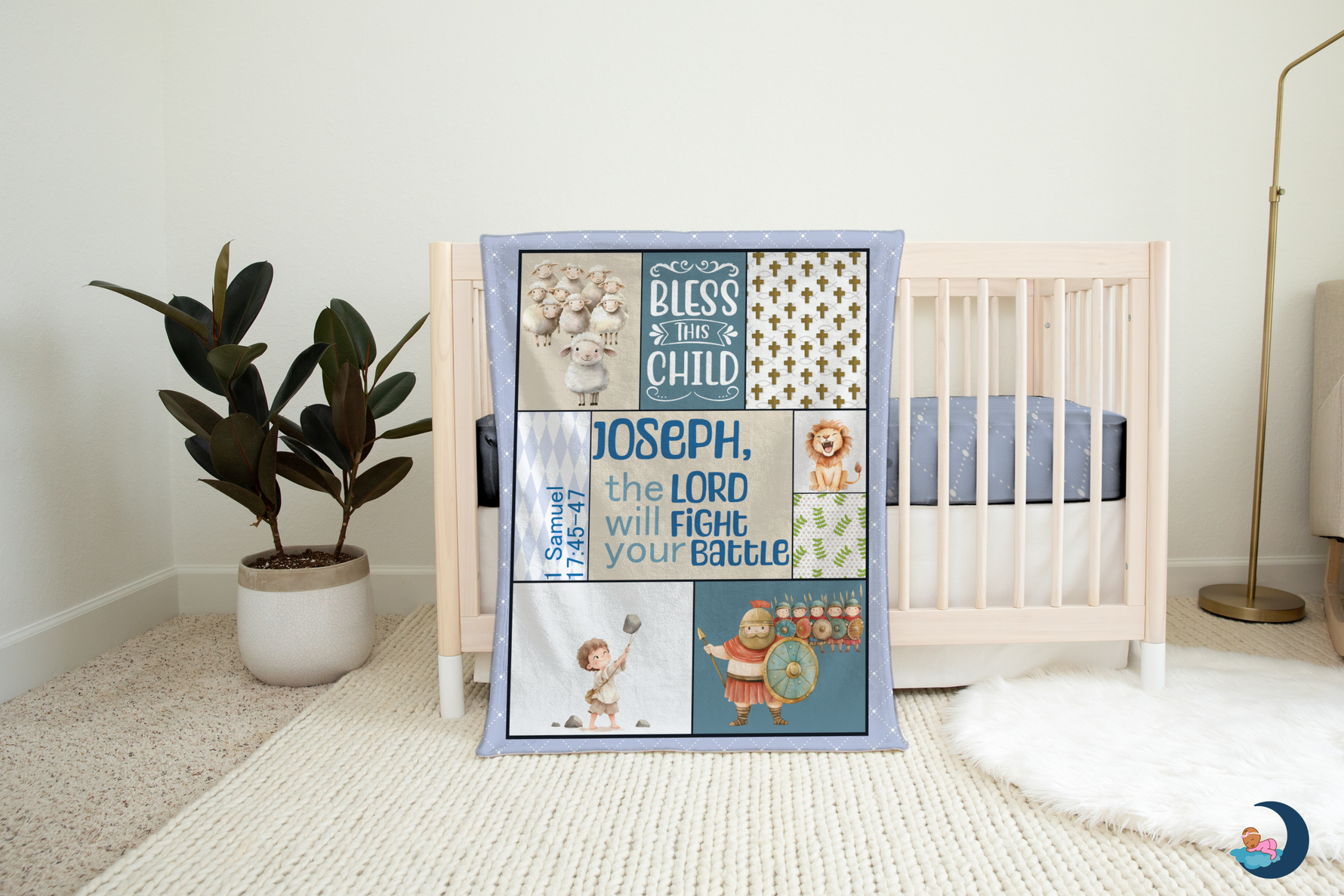 Wrap your beloved little one in cozy comfort with our personalized baby blanket. The David & Goliath Blanket showcases beloved Bible characters and meaningful scripture, serving as a treasured reminder of God's endless love for His followers.
