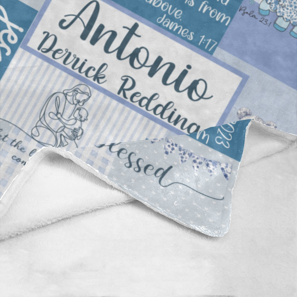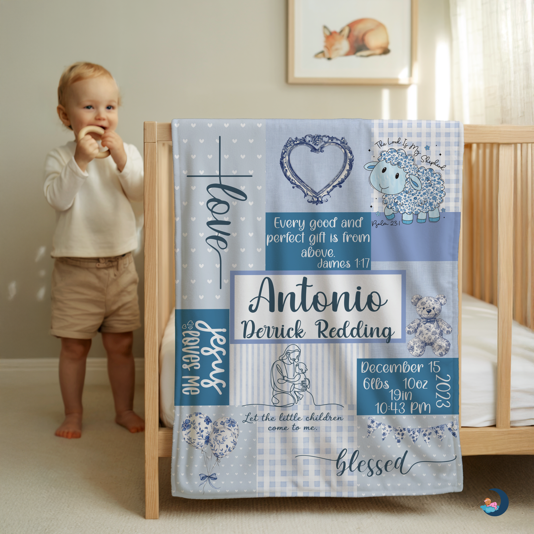 This faith-filled baby blanket is a perfect gift to wrap your little boy in God's reminder of His protection and love! Featuring soft hues of blue tones, uplifting Psalms scriptures, and cute graphics, it's perfect for snuggles, nursery décor, or a meaningful faith-filled baby gift.