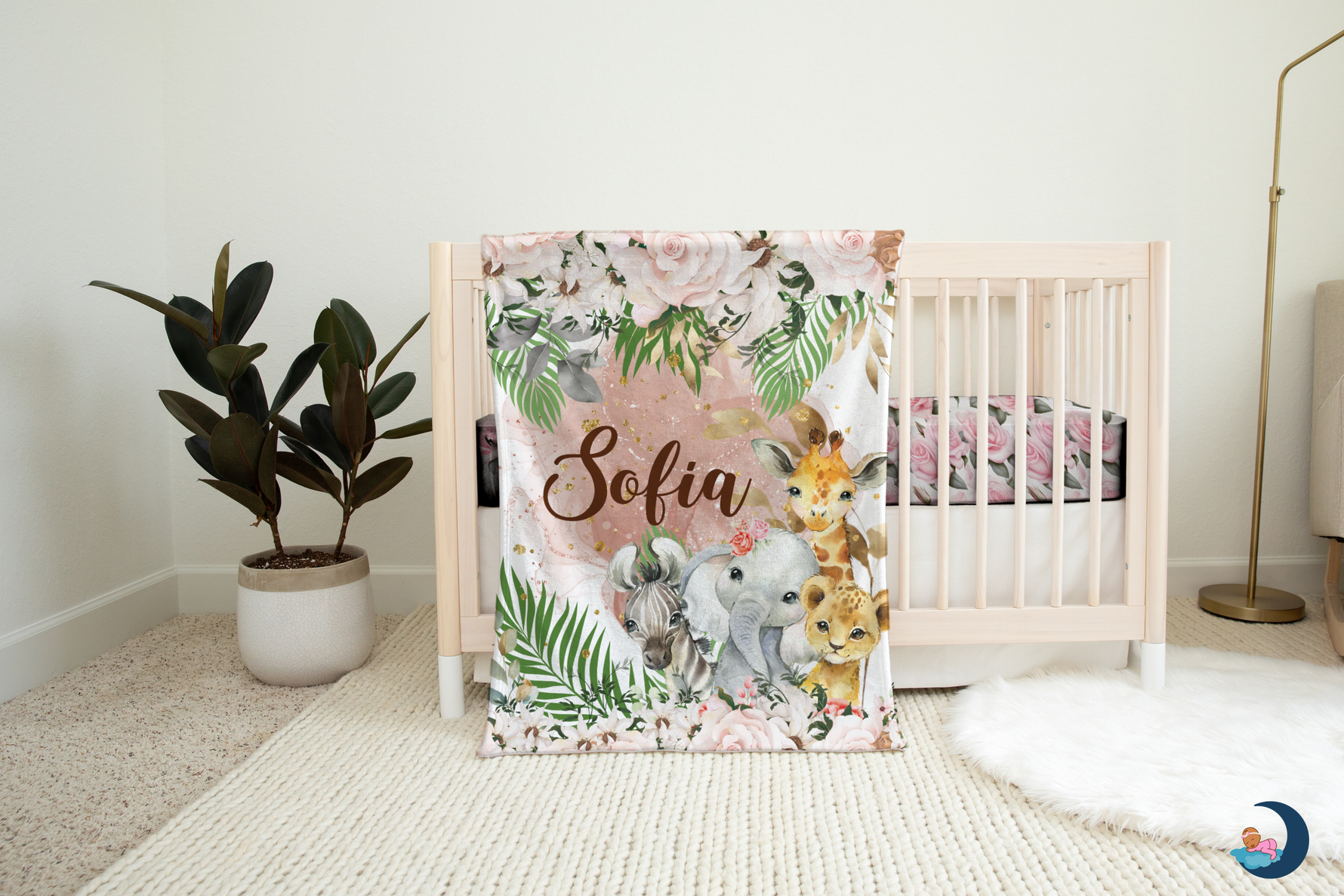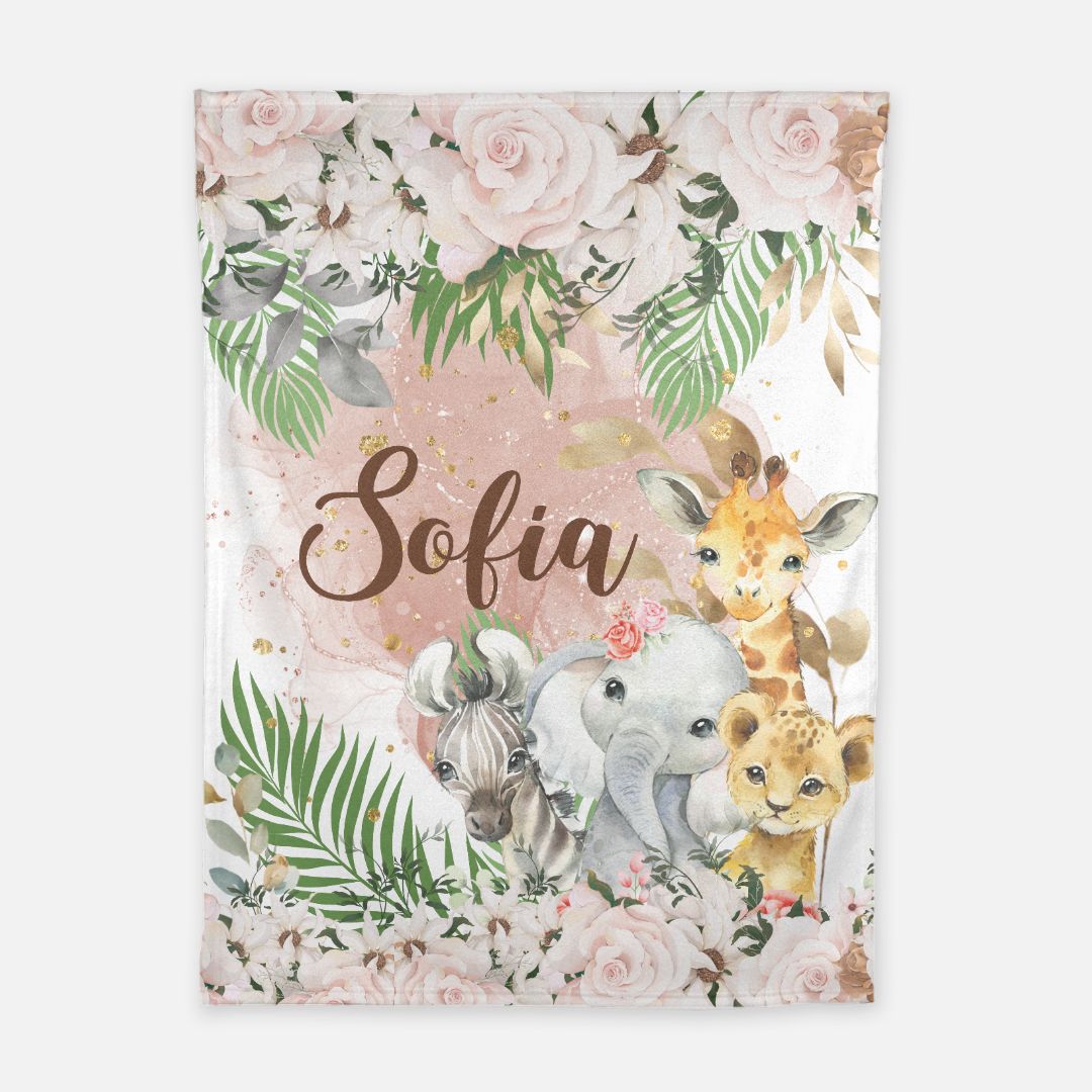 Wrap your little one in comfort with this personalized safari baby blanket! Featuring adorable jungle animals, lush florals, and your baby’s name, this ultra-soft blanket is perfect for snuggles, nursery décor, or as a thoughtful baby shower gift.