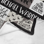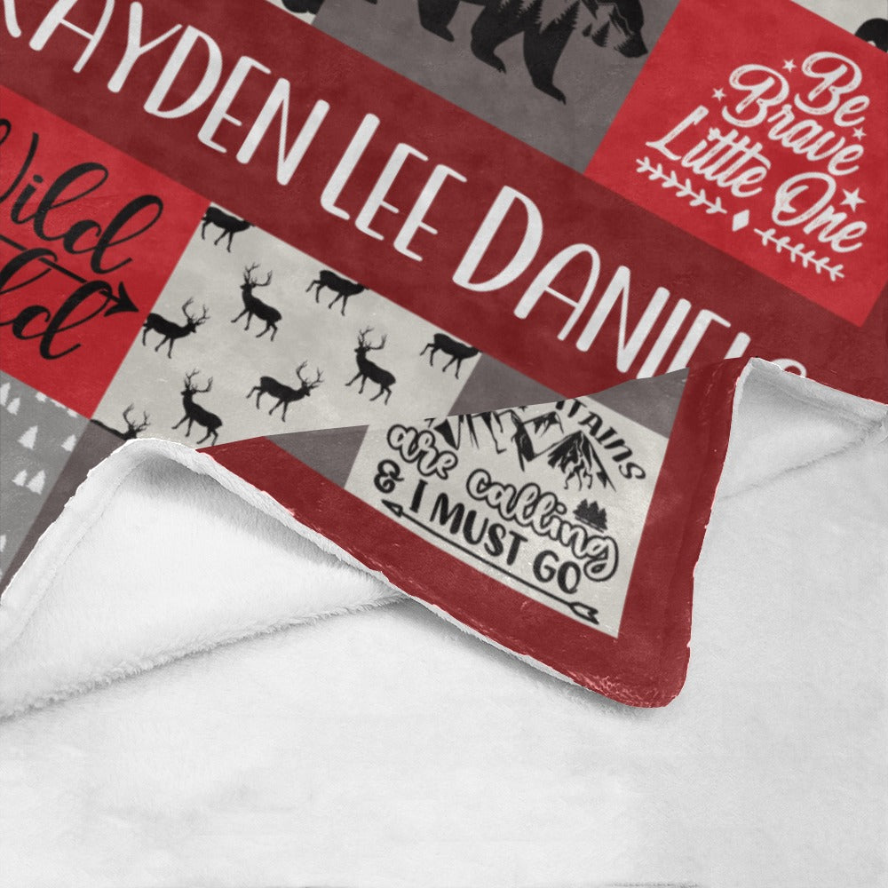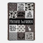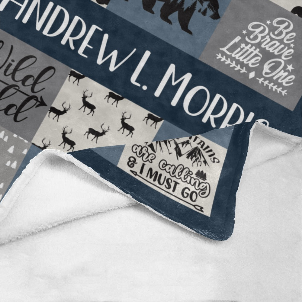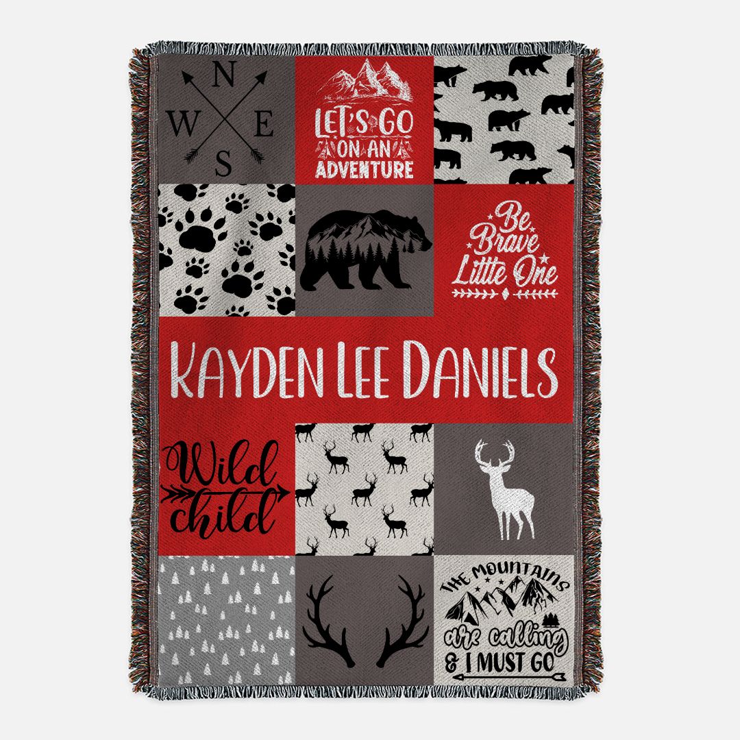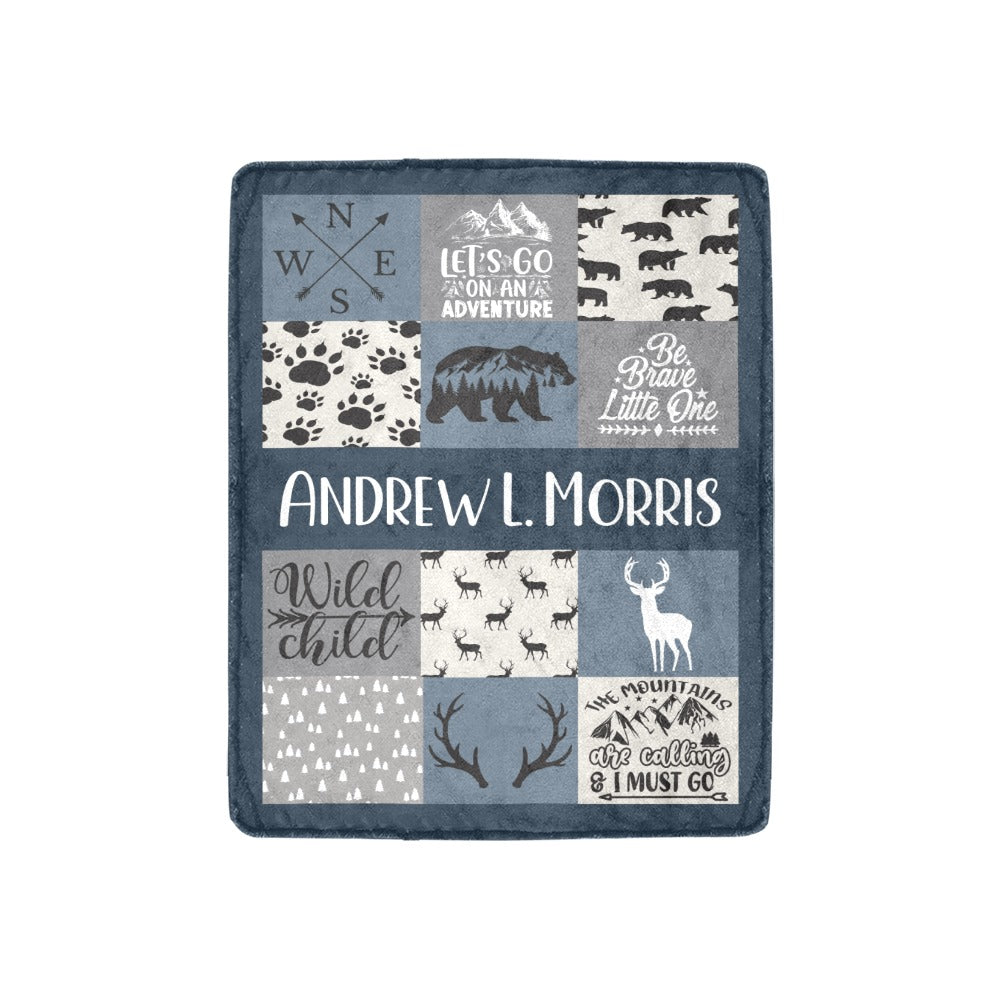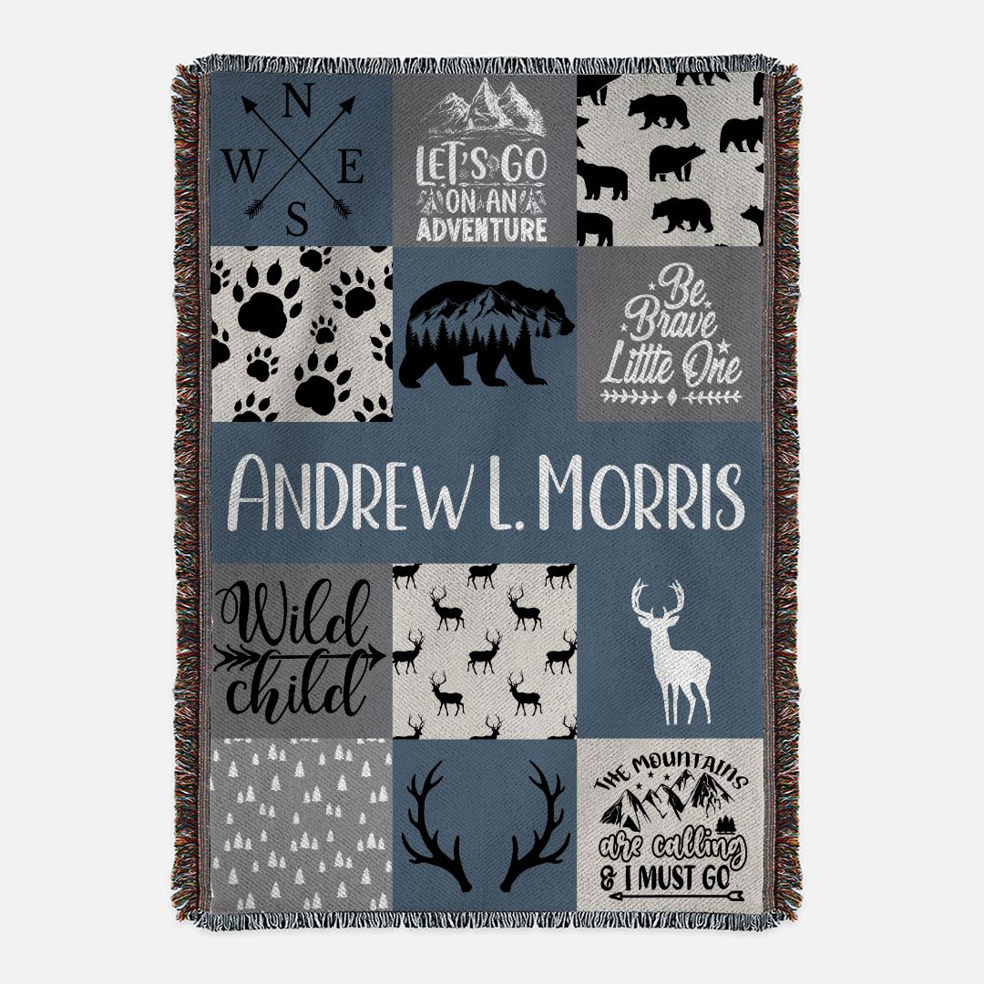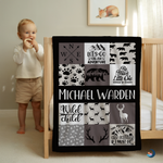 Bring the spirit of adventure to your little one’s nursery with our Woodland Explorer baby blanket. Designed in a rustic woodland patchwork style, this cozy blanket features bears, deer, paw prints, antlers, and inspiring quotes. Perfect for your little explorer, it combines modern mountain charm with timeless comfort.