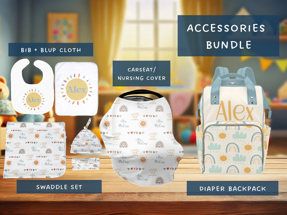 Make every outing and cuddle session extra special with our Personalized Baby Accessories Bundle. Thoughtfully designed for style, comfort, and convenience, this bundle includes everything new parents need to stay organized and keep baby cozy on the go.
